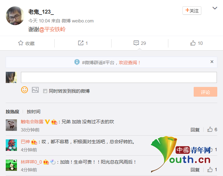 中國青年網北京3月31日電(記者 張瑞宇)3月31日上午,微博@平安鐵嶺 發布一則關于挽救"微博直播自殺"者劉某生命的警務報道。網友反饋一注冊名稱為"老鬼_123_"用戶IP地址顯示為遼寧省鐵嶺市的微博用戶,30日上午11:53發布了一則聲稱開始自殺的微博,后經查找,因投資失敗已喝兩瓶老鼠藥的劉某被警方送到鐵嶺中心醫院救治。