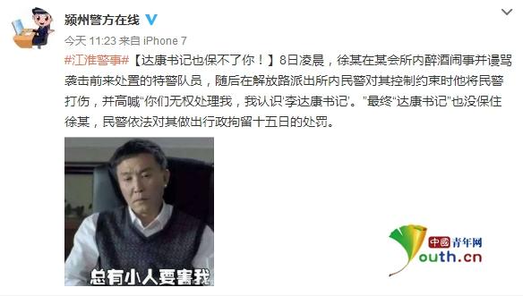 中國(guó)青年網(wǎng)北京4月10日電 據(jù)微博認(rèn)證為“安徽省阜陽(yáng)市潁州公安分局”的賬號(hào)@潁州警方在線發(fā)布消息稱,8日凌晨,徐某在某會(huì)所內(nèi)醉酒鬧事并謾罵襲擊前來(lái)處置的特警隊(duì)員,隨后在解放路派出所內(nèi)民警對(duì)其控制約束時(shí)他將民警打傷,并高喊“你們無(wú)權(quán)處理我,我認(rèn)識(shí)‘李達(dá)康書記’!