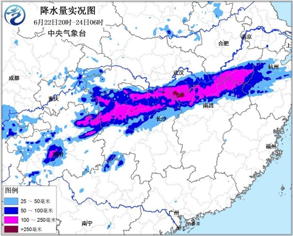 22日夜間以來,貴州至江南北部一帶出現區域性強降雨過程,貴州中部和東北部、湖南北部、湖北東南部、江西北部、安徽南部等地累計雨量超過100毫米,湖北咸寧、湖南岳陽和常德、江西九江等局地達250~365毫米。