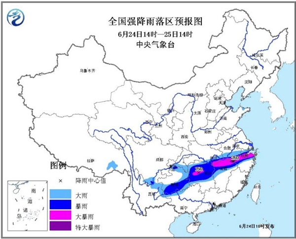 中央氣象臺將暴雨預警升級為橙色。中央氣象臺6月24日10時發布暴雨橙色預警:預計,6月24日14時至25日14時,江南中北部以及重慶南部、云南東北部、貴州南部和東部、廣西西北部等地有大到暴雨,其中,湖南西北部、江西北部、湖北東南部、安徽南部、浙江北部等地的部分地區有大暴雨,江西東北部、安徽南部、浙江西部局地有特大暴雨(250~260毫米)。上述部分地區有短時強降水、局地伴有雷暴大風等強對流天氣,最大小時雨強30~60毫米,局地可達80毫米。