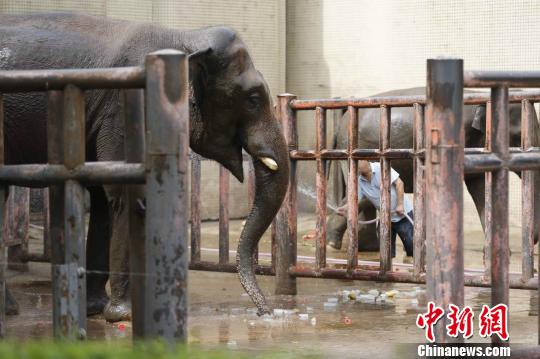 “亞洲象在夏天很喜歡水,所以我們主要是通過淋浴、食物和藥物的方式對(duì)它們進(jìn)行防暑降溫。”重慶動(dòng)物園高級(jí)畜牧師滕明生說,當(dāng)環(huán)境溫度達(dá)到37℃以上時(shí),會(huì)給亞洲象投放降溫食物。“淋浴是隨時(shí)在做,當(dāng)它表現(xiàn)得煩躁時(shí),就會(huì)給它身上淋水,還會(huì)把大象活動(dòng)周邊區(qū)域都澆濕。”滕明生說,夏季飼養(yǎng)員還會(huì)將防暑降溫的藥品“十滴水”根據(jù)大象體重調(diào)配后放入飲水中,“每天上午下午都喂一次”。