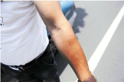 來自安徽的劉士成,是一名資深的哥,40多歲的他,在下沙開出租車已有10年之久,行駛的路程共計有53萬多公里。“我一天至少10個小時在車上,左胳膊靠著車窗,天天曬。右胳膊離窗戶遠些,就還好,時間一長就成這樣啦。”劉師傅說著,有點無奈地亮出自己格外明顯的“陰陽手”。