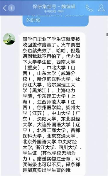 北青報記者在加其名為“保研集結號~魏編輯”的QQ號后,對方立即發來“同學們畢業了學生證就要被收回蓋作廢章了。火車票磁條也就失效了,哈哈,但是遇到我不怕……”的消息,同時發出的可以代辦的大學學生證的學校名,其中包括首都醫科大學、北京交通大學、北京外國語大學、浙江大學、四川大學等全國二十余所高校。隨后還發來“260元帶磁條,70元只辦學生證但會送假磁條,贈送實物注冊章”等字樣。
