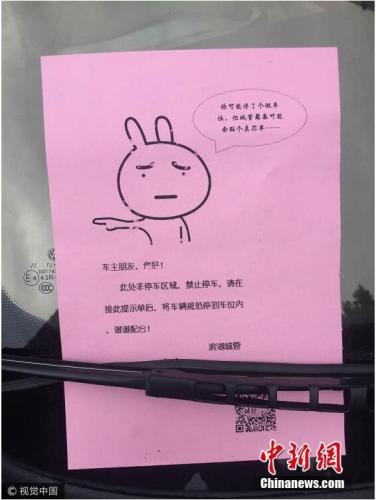 “春風十里不如你,論停車,我只服你”、“你可能停了個假車,但城管蜀黍可能會貼個真罰單”……網絡卡通形象兔斯基配上調皮的語言,這樣的停車提示單讓人忍俊不禁。