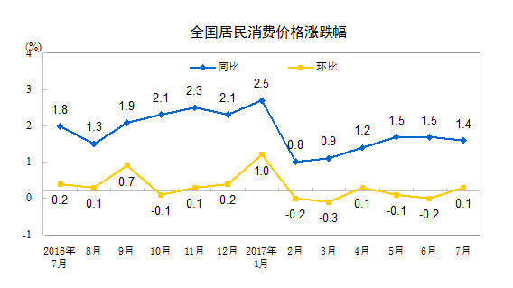 2017年7月份,全國(guó)居民消費(fèi)價(jià)格同比上漲1.4%。其中,城市上漲1.5%,農(nóng)村上漲1.0%;食品價(jià)格下降1.1%,非食品價(jià)格上漲2.0%;消費(fèi)品價(jià)格上漲0.5%,服務(wù)價(jià)格上漲2.9%。1-7月平均,全國(guó)居民消費(fèi)價(jià)格總水平比去年同期上漲1.4%。
