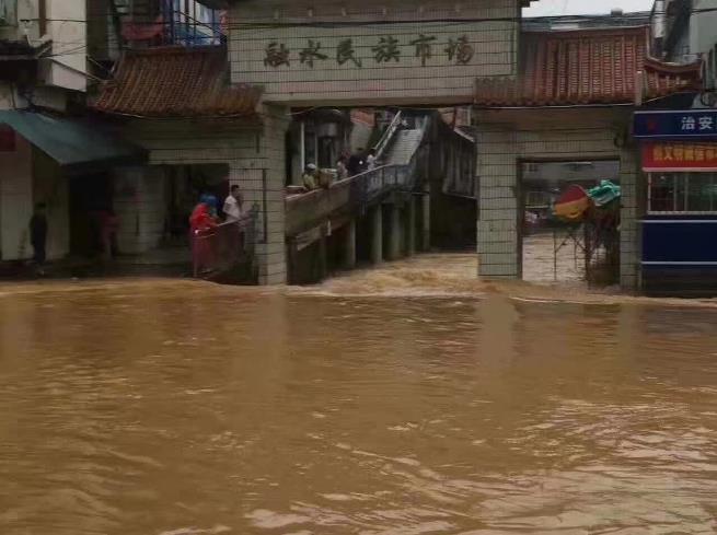 目前當(dāng)?shù)剡在持續(xù)降雨中。7條街道被水浸泡。當(dāng)?shù)卣M織交警上街疏導(dǎo)交通,消防、武警出動(dòng)橡皮艇轉(zhuǎn)移群眾。沿街商鋪的店主在收到水情通報(bào)后,在昨天已經(jīng)開始有序轉(zhuǎn)移物資。