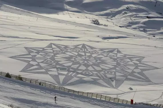 這其實(shí)是世界上第一個(gè)雪藝家Simon Beck的杰作。這些神奇的畫都是他用腳踩出來(lái)的…………