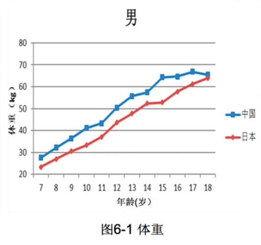 其中,2014年,7-18歲中國男生平均體重48.7kg,高于日本男生的44kg,而在2016年,7-18歲中國男生平均體重50.4kg,高于日本男生的44.3kg。