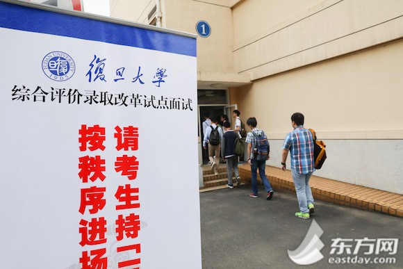 圖片說明:參加復旦大學綜合評價錄取改革試點校測面試的考生們正在有序進場。慕梁攝