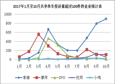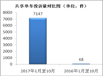 央廣網上海11月16日消息(記者傅聞捷)今年以來,共享單車投訴量呈爆發式增長。2017年1月至10月,上海市消保委共受理相關投訴7147件。投訴量位居前三位的分別是享騎、摩拜和OFO。其中,享騎的投訴量增長明顯,達3771件,遠高于其他共享單車企業。