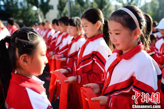 資料圖:某小學高年級同學為一年級新生佩戴紅領巾。(圖文無關) 中新社記者 劉文華 攝