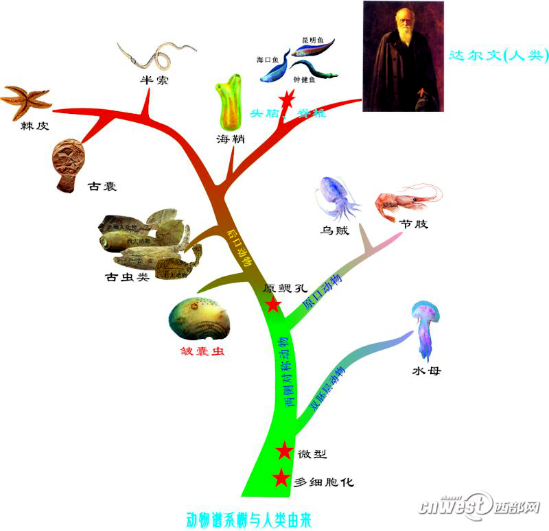 借助生物學和古生物學信息構(gòu)建動物譜系樹并探尋其起源,是理清人類遠古祖先演化脈絡的前提。由西北大學舒德干院士領軍的早期生命研究團隊經(jīng)過多年來對云南澄江生物群的研究,在國際上首次揭示出脊椎動物、頭索動物、尾索動物、棘皮動物、古蟲動物等后口動物亞界幾乎所有門類的原始代表,為人類探索早期遠祖的來龍去脈提供了基礎證據(jù)。
