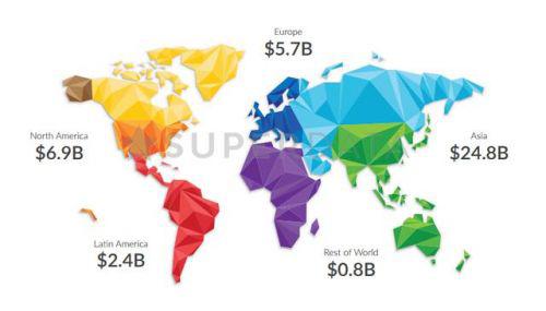 報告指出,2016年VR市場PC端總產值為7.18億美元,移動端6.87億美元,主機端為4.11億美元。在營收中,游戲表現搶眼,占據了44%的市場份額。除此之外,數據顯示,全球移動游戲收入為406億美元,手游市場規模已與全球電影票房收入持平,而且仍在高速增長。亞洲市場在整個手游市場中占據領導地位,份額達248億美元,北美以69億美元位居其次,歐洲以57美元位居第三。(TechWeb)