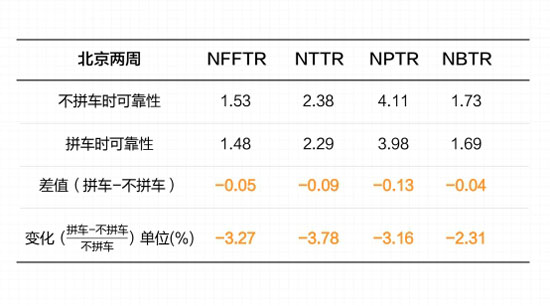 通過對比隨機兩周內有拼車和無拼車情況下的北京交通可靠性指標,報告發(fā)現(xiàn)拼車可以讓NPTR(網絡規(guī)劃行程時間率)值減少0.13,NBTR(網絡緩沖行程時間率)值減少0.04。前者意味著在擁堵時拼車讓北京居民平均每千米節(jié)省7.8秒,后者則意味著,拼車讓北京居民平均每千米可以少預留2.4秒的出行時間。