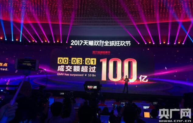 3分01秒,2017天貓雙11全球狂歡節交易額超100億元。