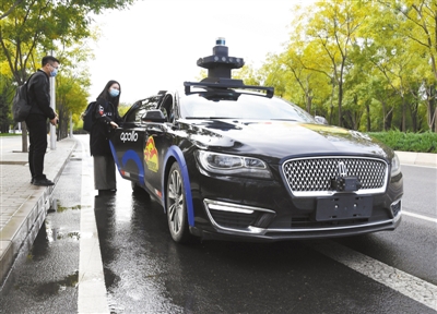 市民在北京市海淀區(qū)稻香湖路的百度自動駕駛出租車指定上車點乘車。新華社記者 任超攝
