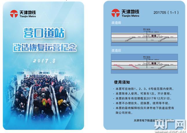 為感謝廣大乘客對營口道站改造的大力支持,天津地鐵運(yùn)營公司將于8月16日同步限量發(fā)行2000套“營口道站改造恢復(fù)運(yùn)營”主題紀(jì)念票。紀(jì)念票含地鐵乘次票一枚,持該票可在地鐵1、2、3、6號線范圍內(nèi)乘車1次,不計(jì)里程,有效期截至2017年12月31日。該紀(jì)念票售價(jià)為20元/套,可在營口道、天津站、西南角、長虹公園、紅旗南路、西站、北站的客服中心購買,每人限購5套。