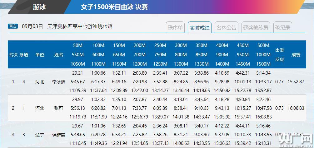 2017天津全運(yùn)會(huì)女子1500米自由泳決賽,年僅15歲的河北小將李冰潔以15分52秒87的成績奪冠,這一成績也打破了亞洲紀(jì)錄!這是李冰潔在本屆全運(yùn)會(huì)上取得的第二枚金牌。同樣來自河北的張可獲得銀牌,遼寧選手侯雅雯獲得銅牌。