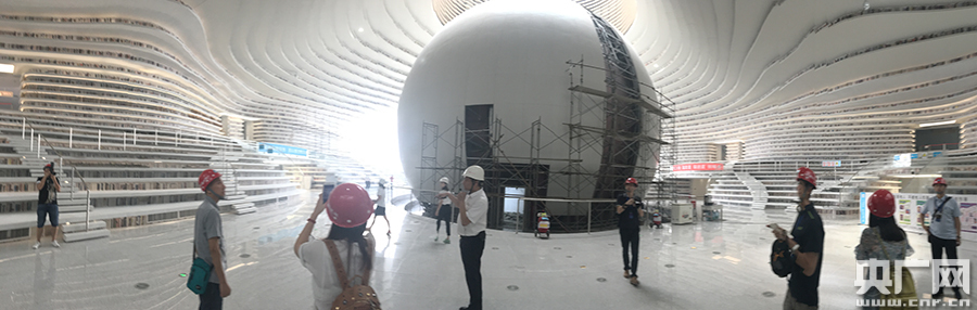 走入濱海文化中心正門,可以看到的是有“濱海之眼”之稱的濱海圖書館,圖書館最大的特點是其內部的球形多功能廳。這個球形多功能廳外部建成了一個穹幕影院,40萬個LED燈珠將鑲嵌在全穿孔鋁板上,大球的外部可以播放電影。大球內部則是濱海圖書館的報告廳,廳內可容納將近100人,并采用可伸縮座椅設計。目前,該圖書館已經運進入18萬冊圖書,而后續藏書量可達130萬冊。