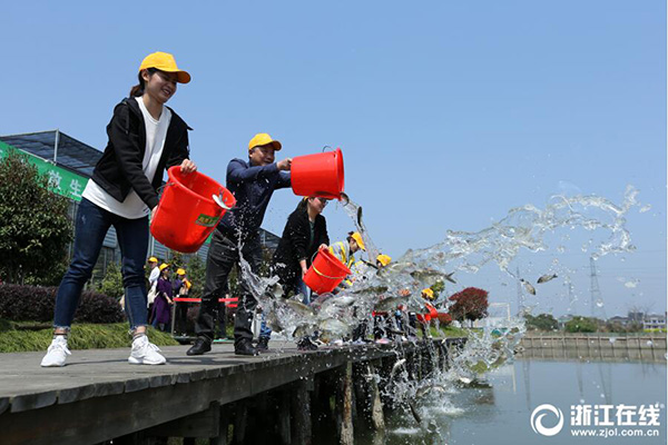 3月27日,德清縣乾元鎮(zhèn)各級人大代表、新居民以及當?shù)赜變簣@小朋友等50多人,在該鎮(zhèn)聯(lián)合村、恒星村等地,把花鰱、草魚以及花骨魚等2萬余尾魚苗放歸清澈的河水中,以進一步改善水質(zhì),確保“五水共治”成果。(沈興華 倪立芳 攝)