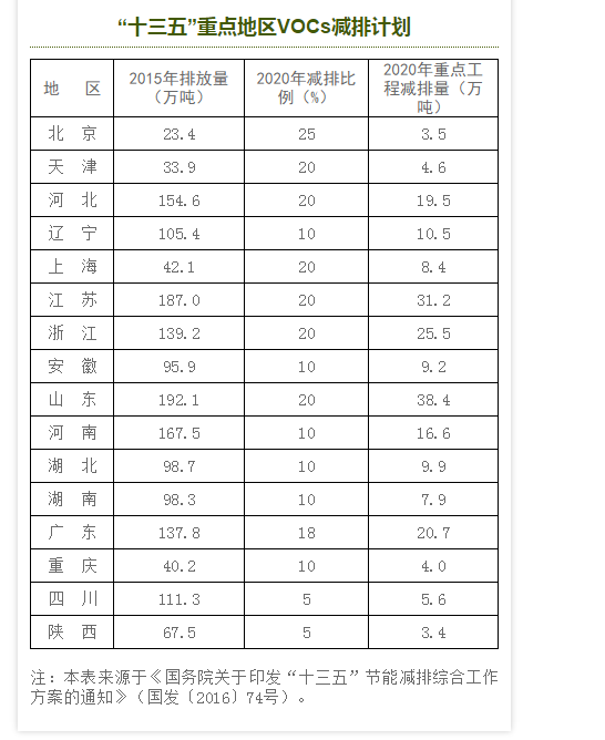 據(jù)悉,到2020年,我國VOCs排放總量下降10%以上。然而,根據(jù)《“十三五”節(jié)能減排綜合工作方案》,浙江至2020年的VOCs減排比是20%,僅次于北京25%的減排比例。